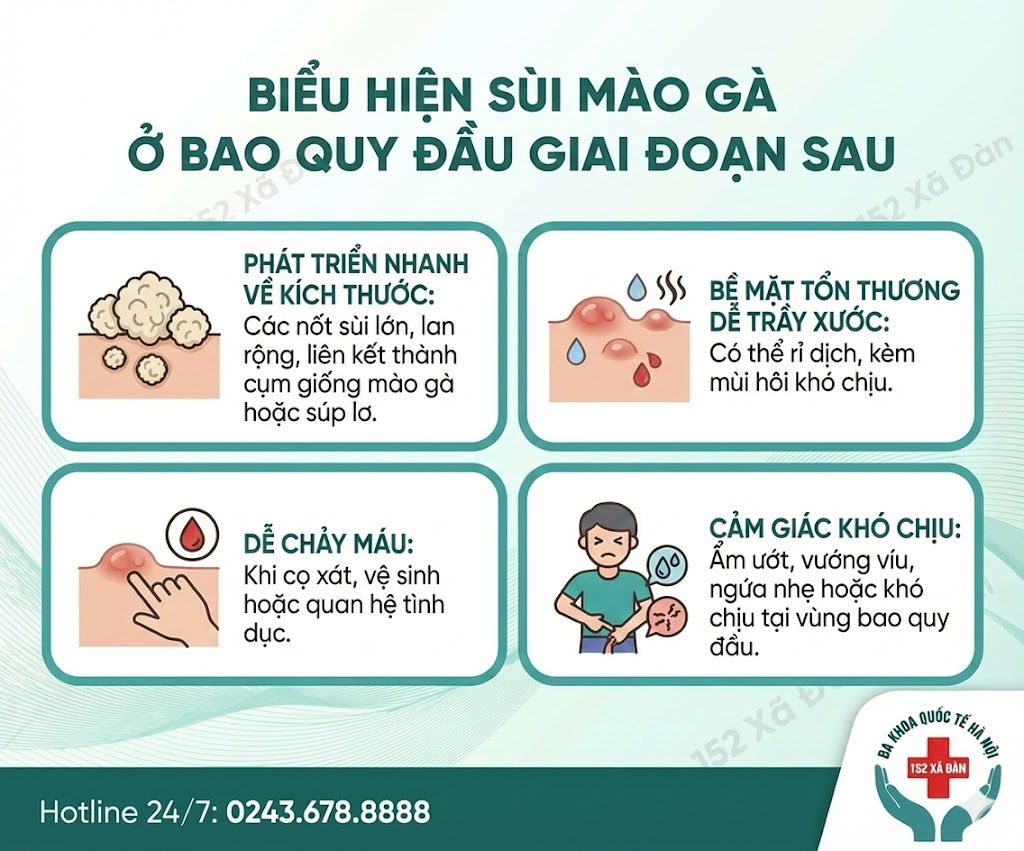 Khi bệnh tiến triển nặng hơn, các dấu hiệu sùi mào gà ở bao quy đầu sẽ ngày càng rõ rệt và dễ nhận biết hơn. Một số biểu hiện điển hình bao gồm: