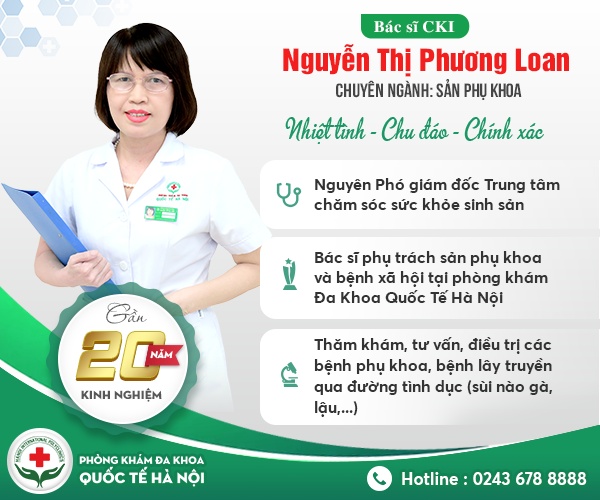 - Nhấp chọn TẠI ĐÂY để khám với Bác sĩ Nguyễn Thị Phương Loan: Nguyên Phó Giám Đốc Trung tâm chăm sóc sức khỏe sinh sản thành phố. Là bác sĩ Phụ sản giỏi với hơn 20 năm kinh nghiệm, đã khám chữa cho hàng ngàn nữ giới mắc bệnh phụ khoa, bệnh lây truyền qua đường tình dục.