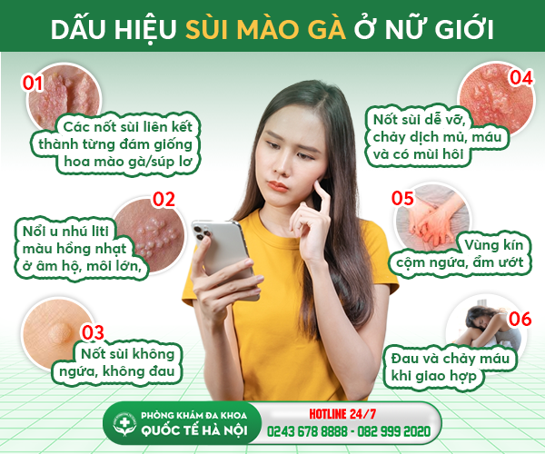 BS.CKI Tạ Thị Hồng Duyên – Chuyên khoa Phụ sản, Đa Khoa Quốc Tế Hà Nội chia sẻ: “Các nốt mụn thịt do sùi mào gà ở nữ ban đầu thường xuất hiện đơn lẻ, không đau không ngứa nên rất dễ bị bỏ qua. Nhưng thực tế, sùi mào gà ở nữ tiến triển chậm, âm thầm, virus HPV có thể tồn tại lâu trong cơ thể và âm thầm tấn công cổ tử cung nếu không phát hiện kịp thời.”